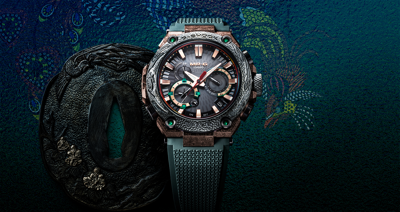 彫金師・小林正雄氏が制作した刀の鐔(つば)をモチーフにMR-Gの「強さと美しさ」を表現したモデルです。 日本刀の刀身と柄の間にある鐔は、柄を握る手を守ると同時に装飾を施こすことで美術的な価値も高いという特徴があります。ベゼルを鐔に見立て小林氏による「鳳凰」の彫金を肉合彫り(ししあいぼり)により施しました。