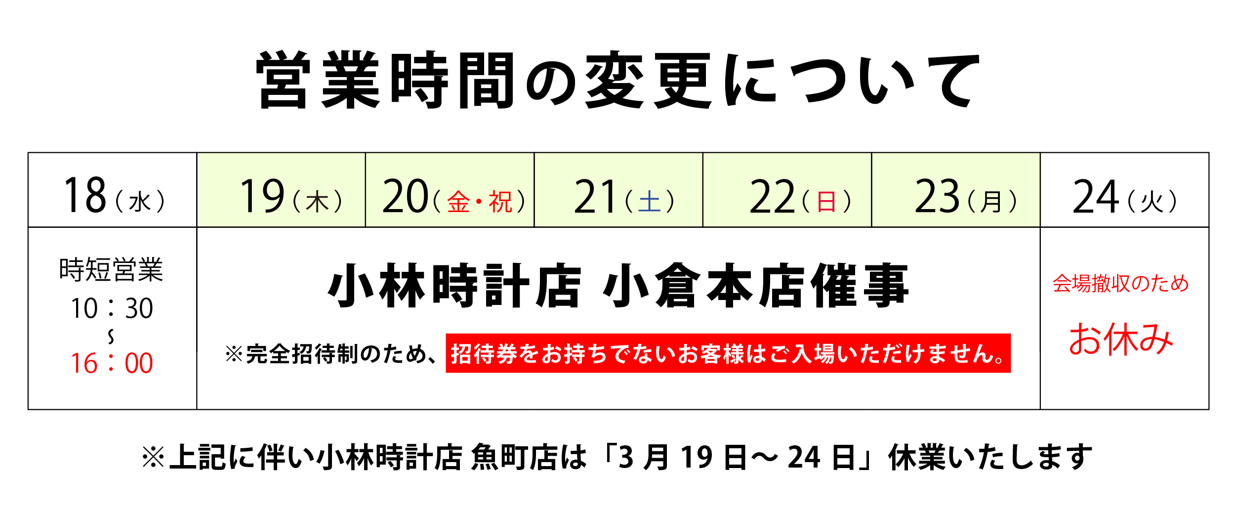 あわせて、同期間中(2025年3月19日~23日)は小林時計店 魚町店は休業となります。