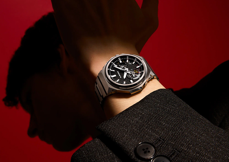 ロゴを排したベゼルは光の角度で表情を変え豊かな質感を演出。ステンレススチール製のバンドにはヘアライン仕上げとミラー仕上げを施し、三つ折れ式中留は端正なデザインとホールドが魅力。