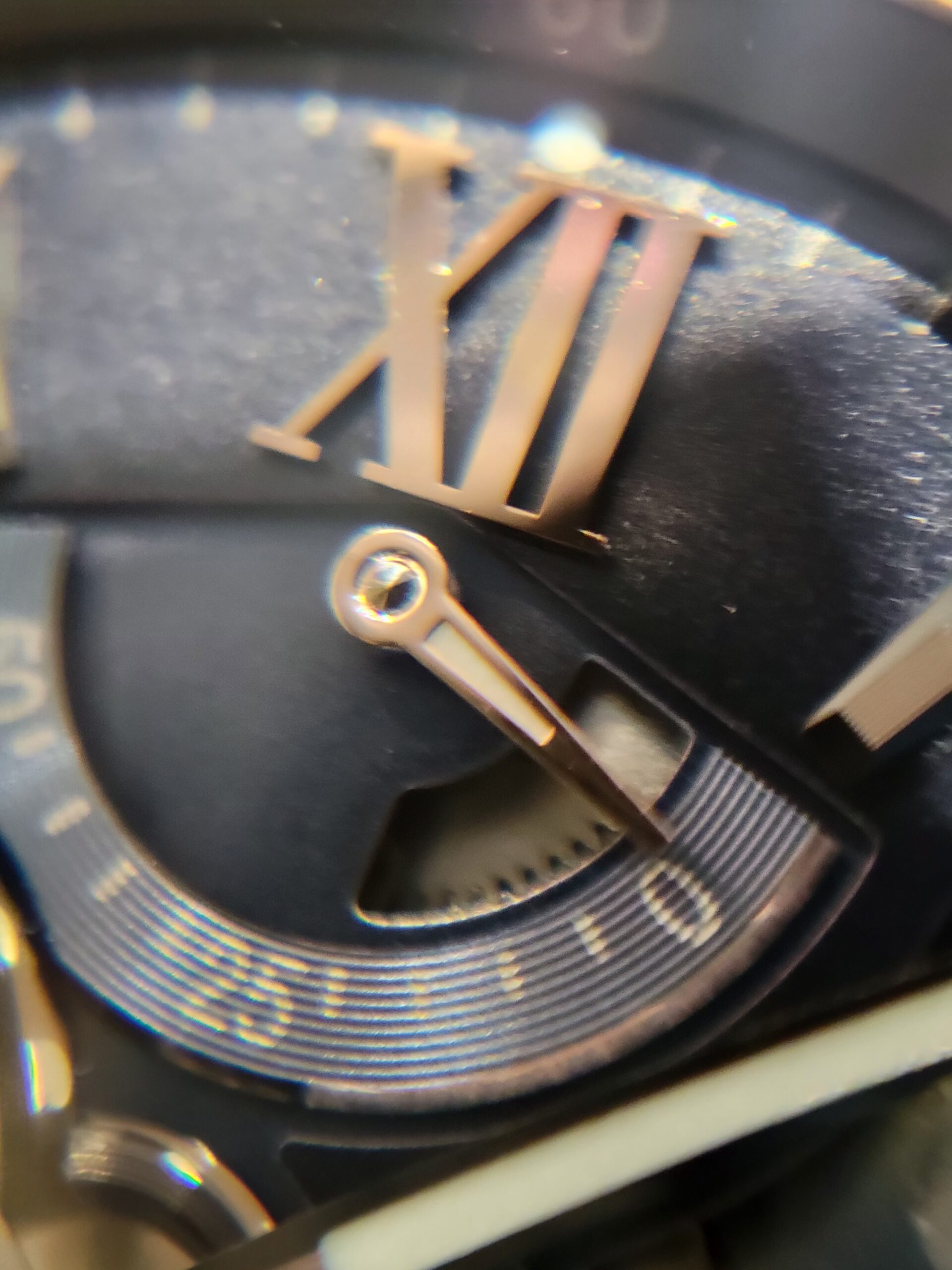 ピンクゴールド色の彩りで上空の月に見立てたローマ数字のXIIや、同色の小秒針や秒針、パワーリザーブ針がブルーグレー文字盤とコントラストを成し、グレーに彩られた時針と分針がまさに雪明かりの穏やかな情景に溶け込んでいますね。ケースバックには限定シリアルを刻んだ特別仕様なのも注目してほしい部分です!