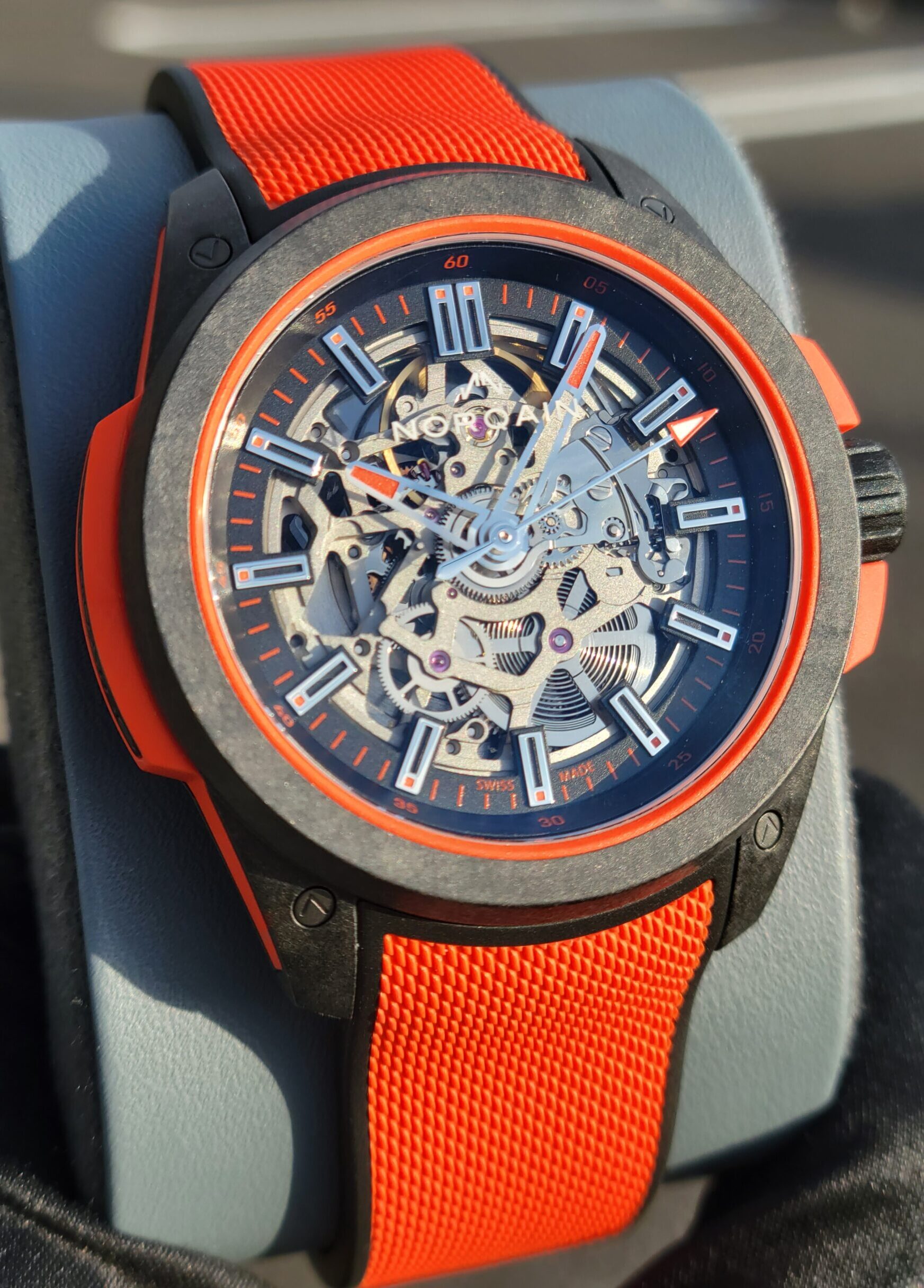 ムーブメントをチタン製のコンテナで保護し、衝撃を吸収してくれるラバー製のショックアブソーバー(オレンジ部分)で包まれているので、テニスやバッティングセンターでの使用も可能なんです!