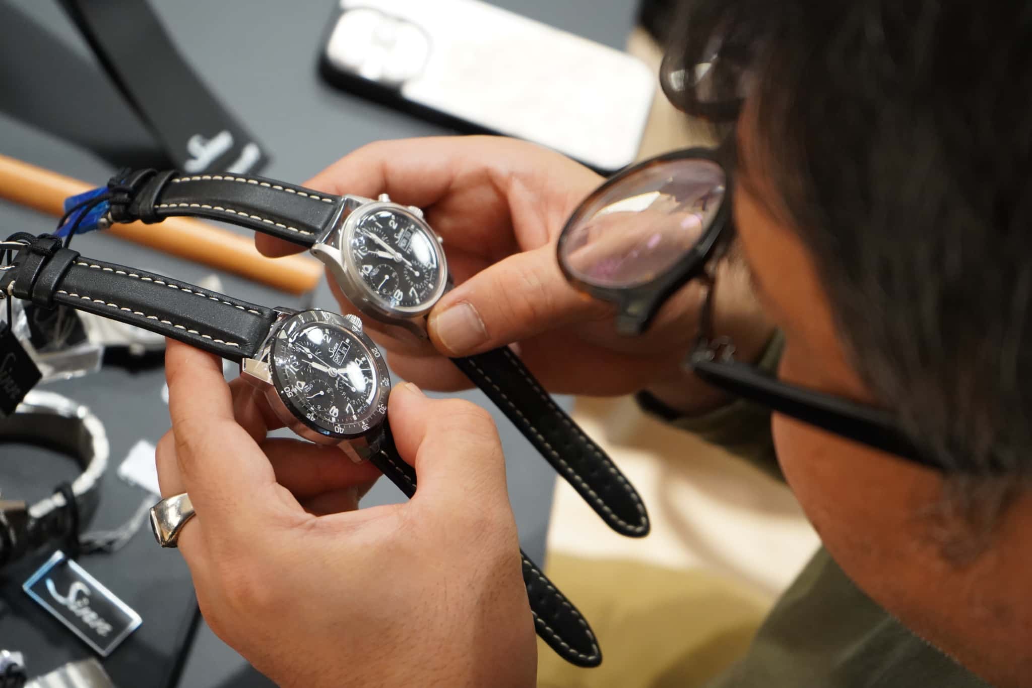 ↑またシンプルなパイロットウォッチの金字塔「556」に追加された3カラーの新作。「最近のジンはお洒落を覚え始めた」と話すように、これまでモノクロな配色でファッション性とは無縁だったジンの文字盤に採用された、数少ないパステルカラーです。型押しによってギヨシェ風のパターンが施され、いい意味でジンらしくない洒落た雰囲気をまとっています。
