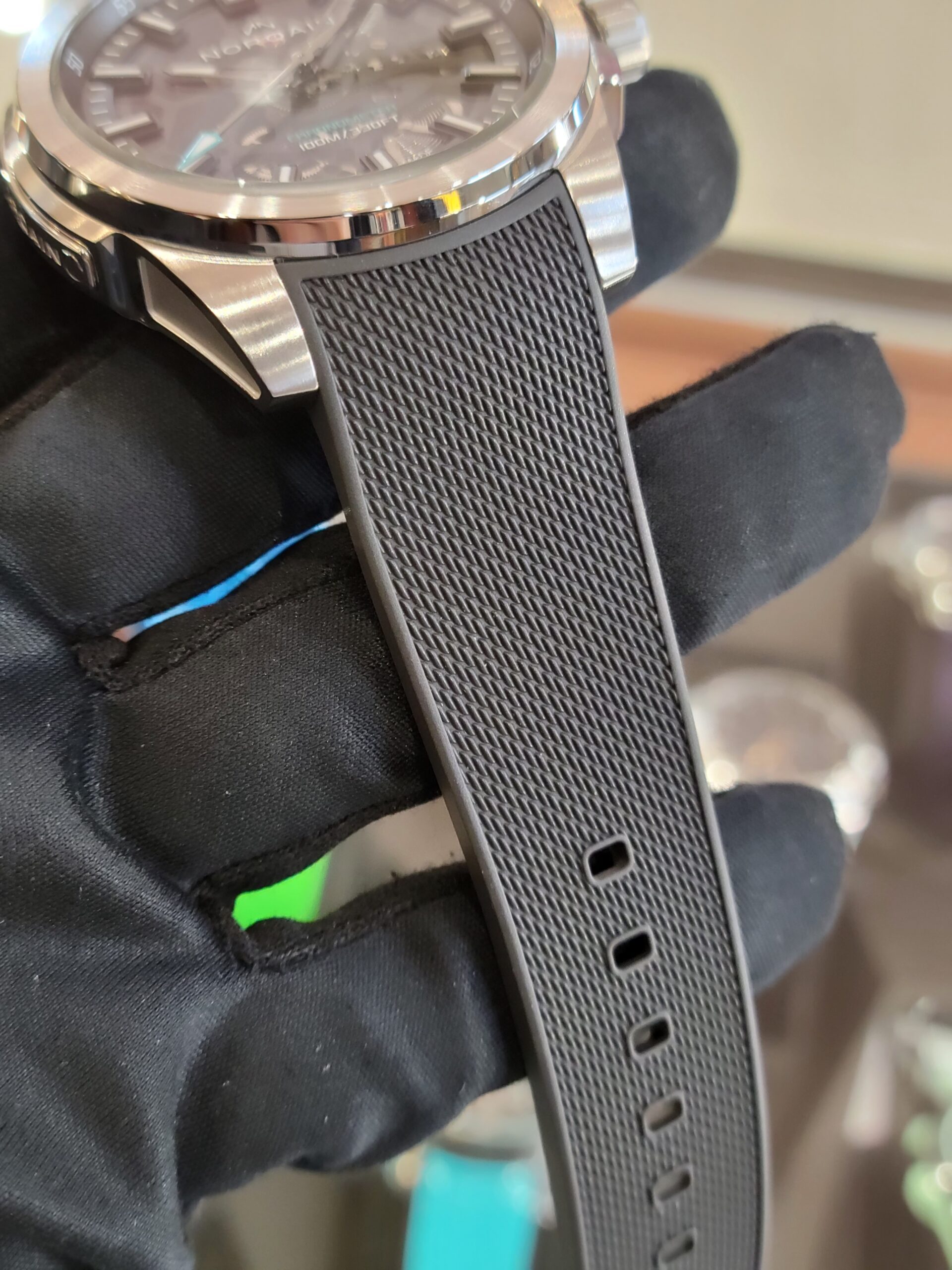 ブラックではなく、落ち着いた柔らかい雰囲気を与えてくれるアンスラサイトのカラーが、ダイヤルカラーとマッチして、よりかっこよさを印象付けてくれます。ラバーストラップの肌触りもよく、腕に着けた時のフィット感も最高です◎