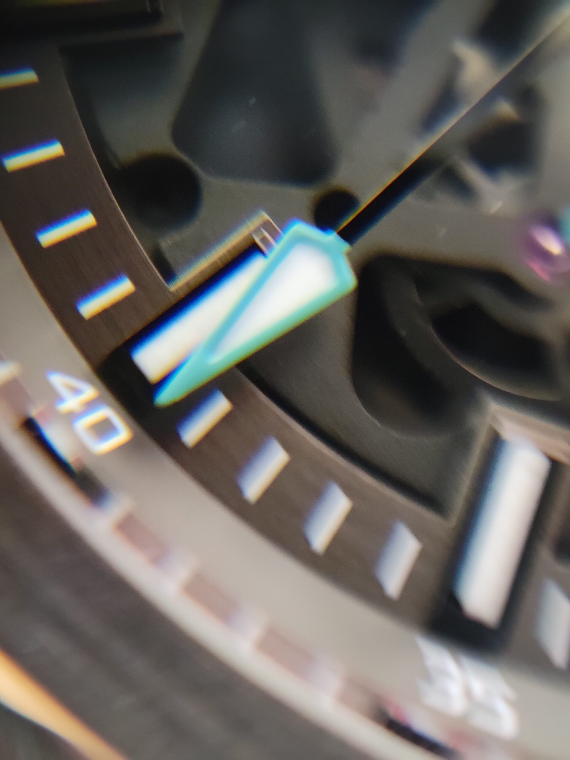 写真2枚目(中央)は、ダイヤモンドカットが施されたブラックプレートセンターに配置された秒針の先端。