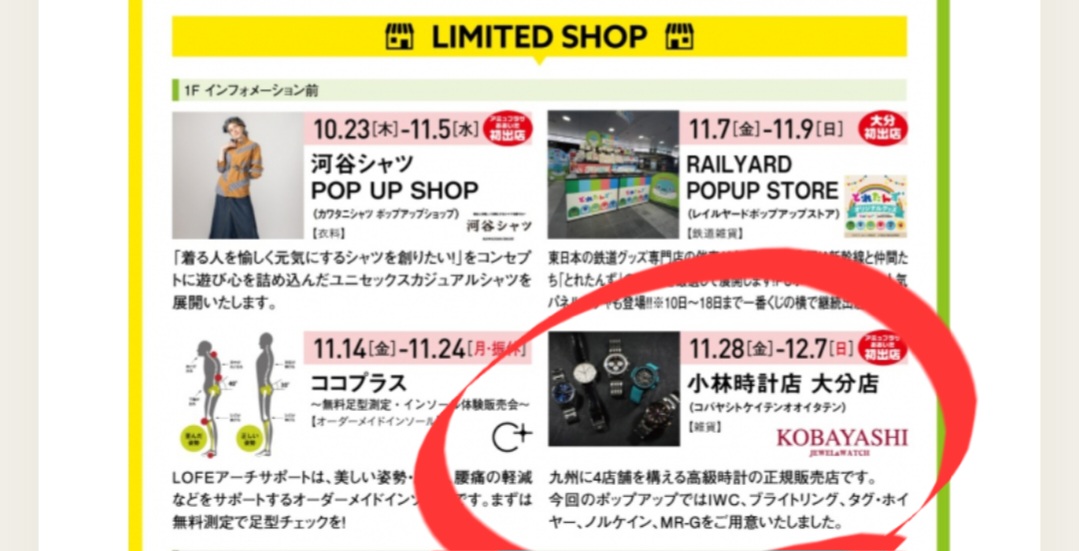 数日前にはなりますが…アミュプラザおおいたさんの公式LINEより、11月のポップアップショップのお知らせページの「LIMITED SHOP」欄に、小林時計店大分店の情報が掲載されていたのをご覧になられましたでしょうか!