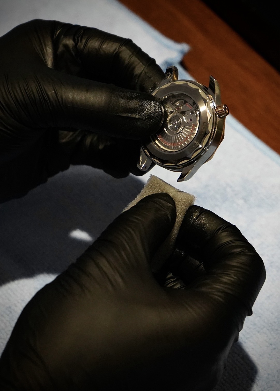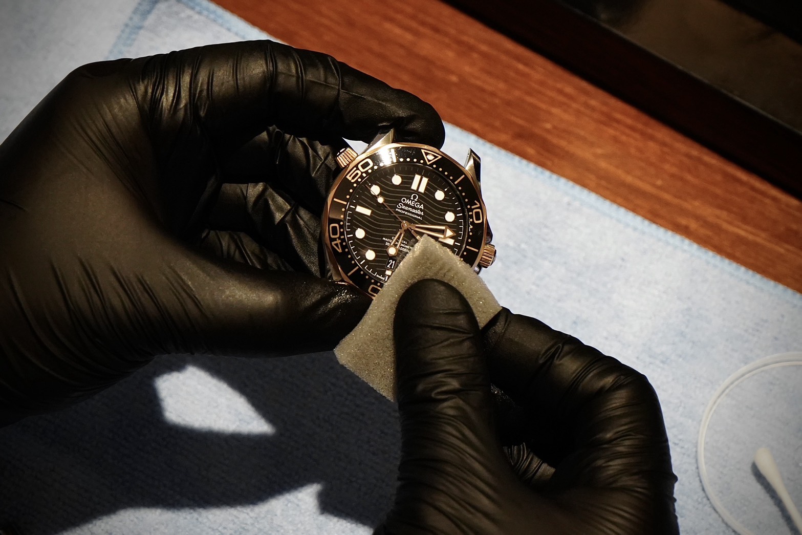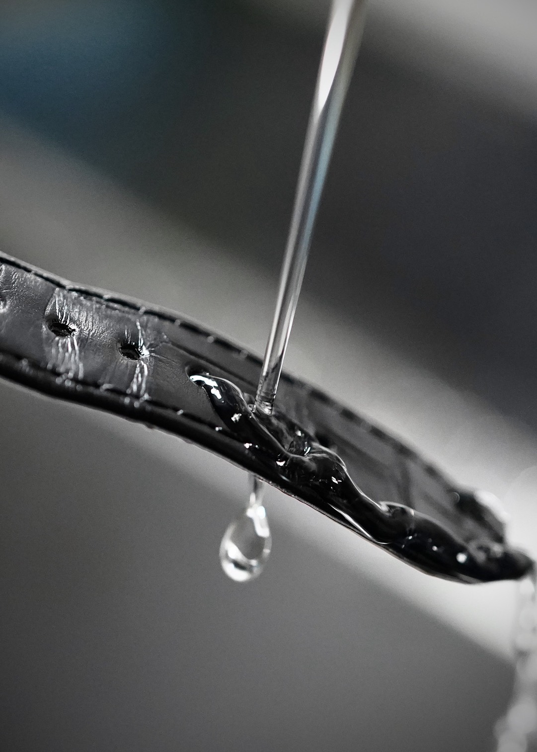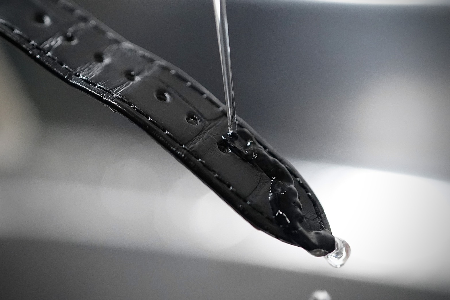 このような感じで時計本体や革ベルトにコーティングをかけると汗に対しても強くなり、季節を問わず使っていただけ、時計へのダメージを遅らせることもできます。