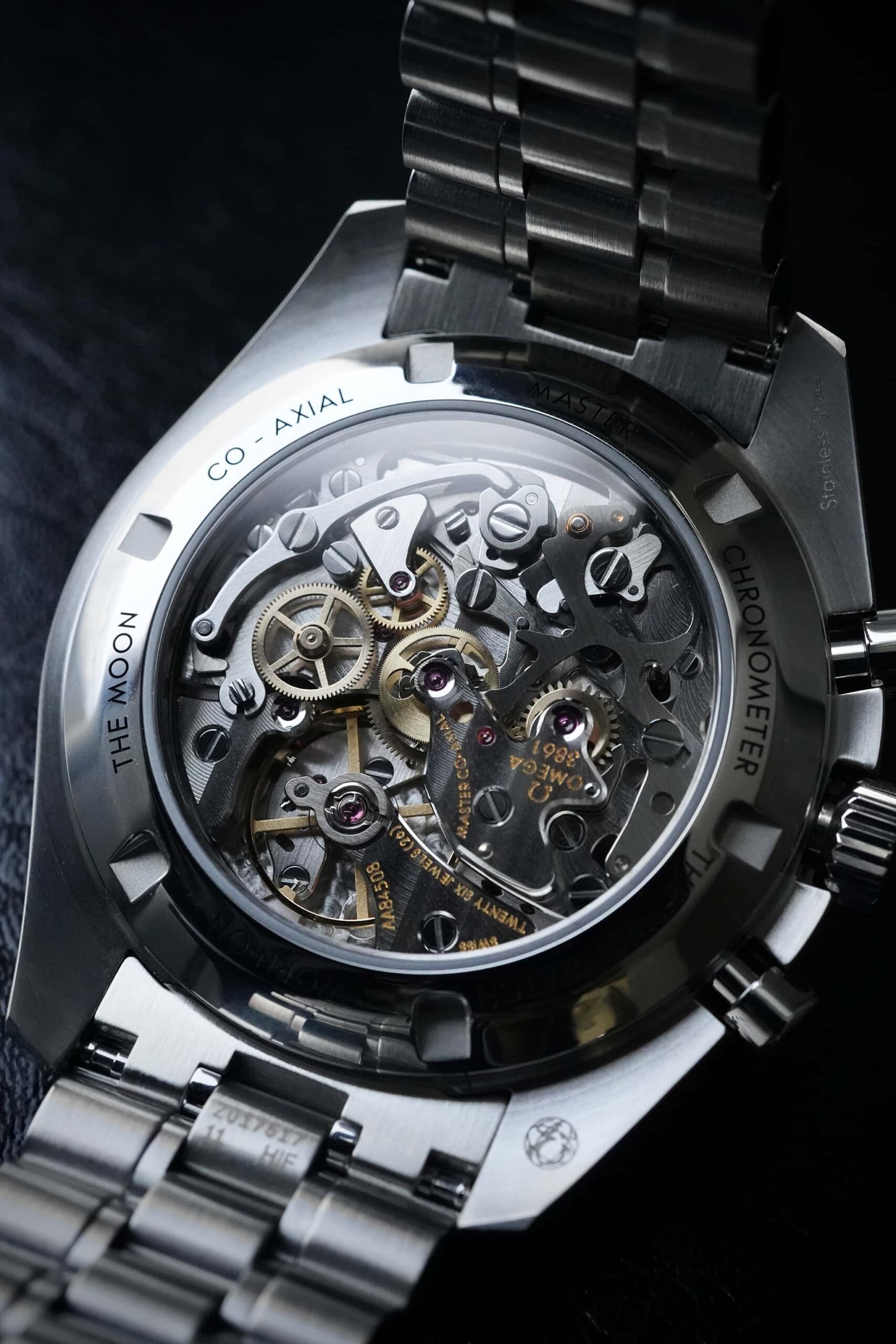上の写真でインダイアルの下部分に影が落ちていることにお気づきでしょうか。これはインダイアルが1段分下がった”サンドイッチ構造”を採用していることに起因します。オメガが「ダブルプレートステップダイアル」と呼ぶこの構造は、少なくともスピードマスターコレクションで採用されることは初とのこと。通常のスピードマスターのインダイアルは、なだらかなすり鉢状になっていることと比較すると、全くの別物と言えます。