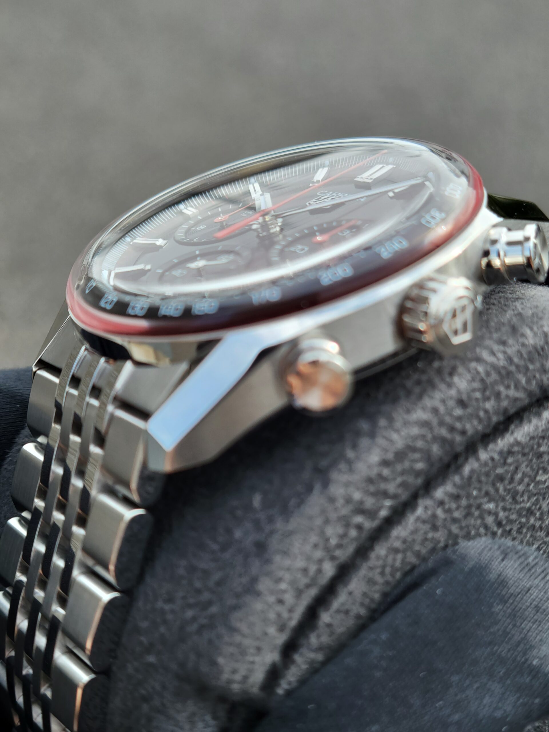 モーターレーシングのDNAを体現する、ダイナミックなデザインに心惹かれる方もいらっしゃるのではないでしょうか。ブラックダイヤルに映える赤い針等が…かっこいいなと感じています。