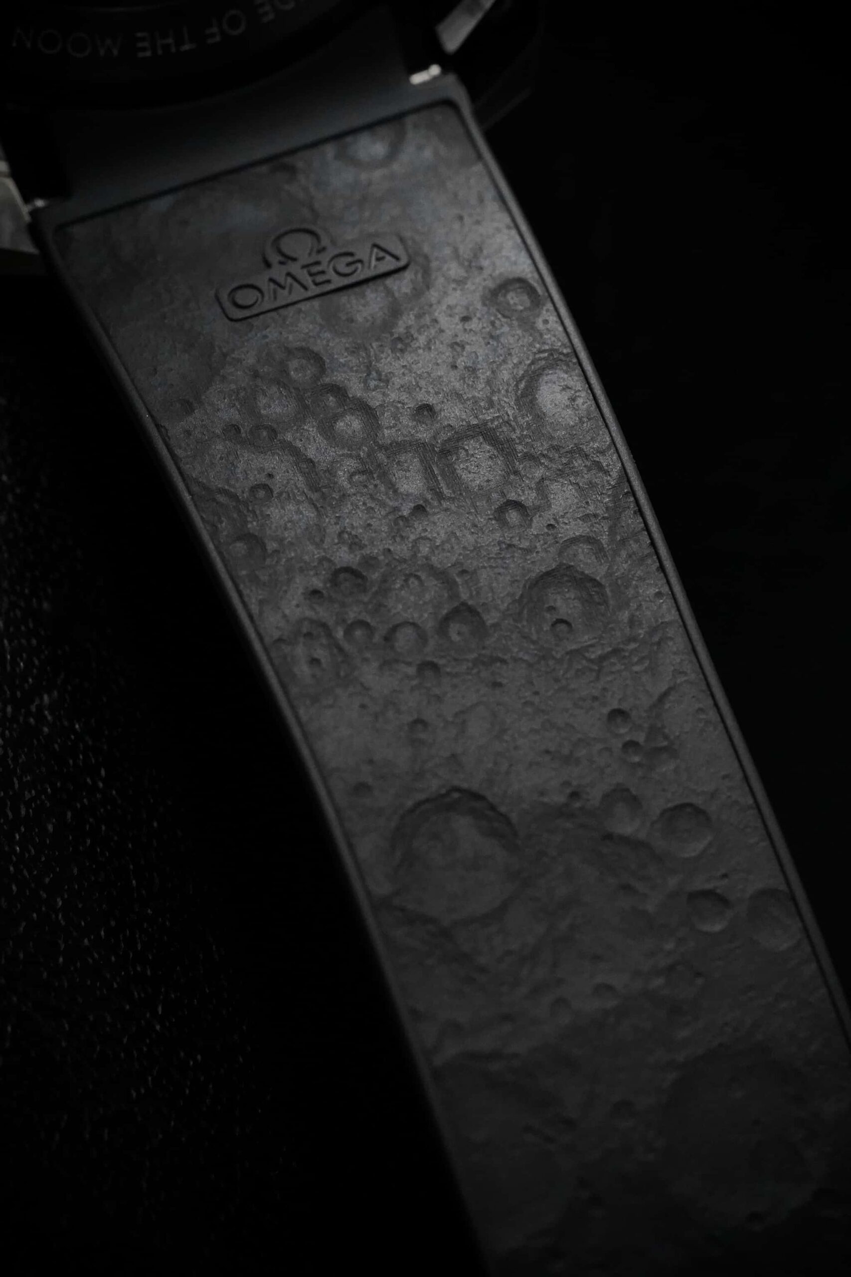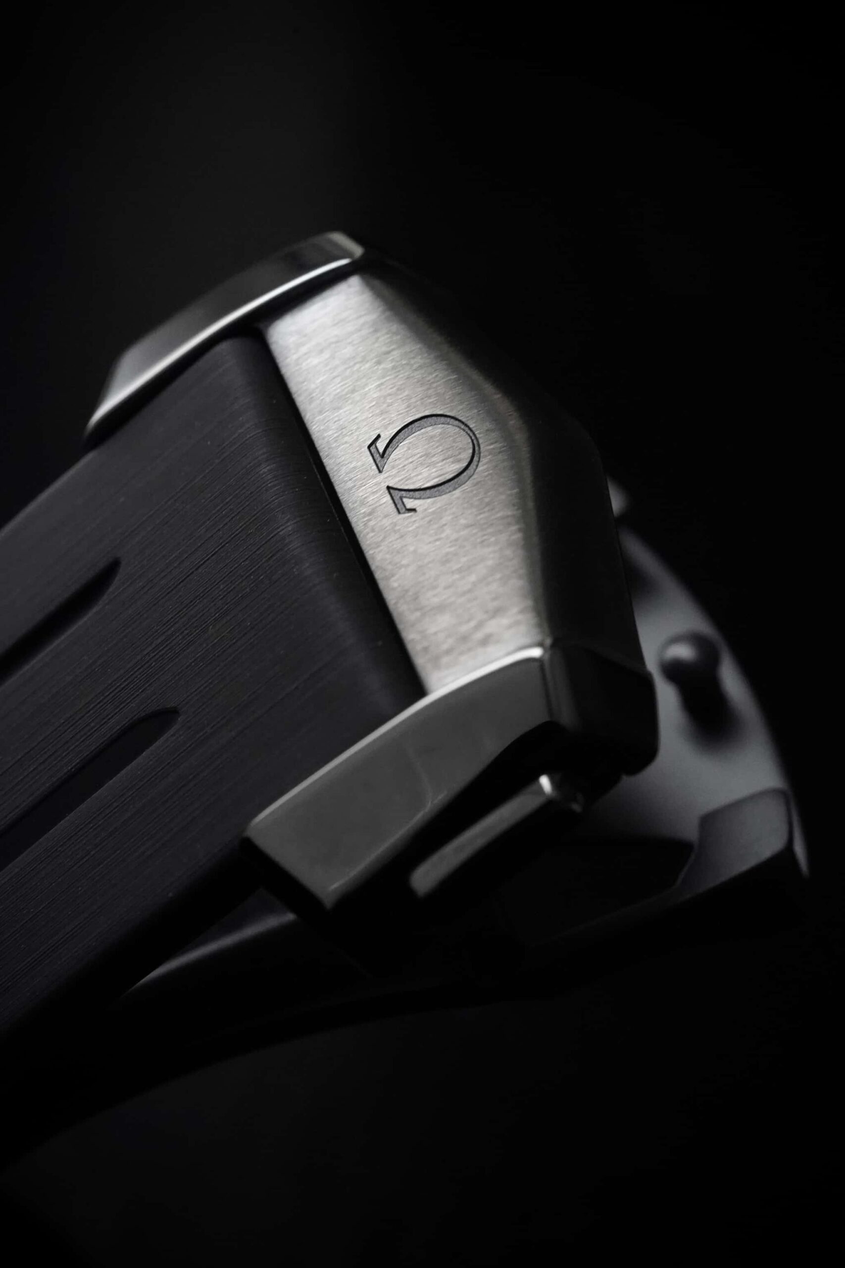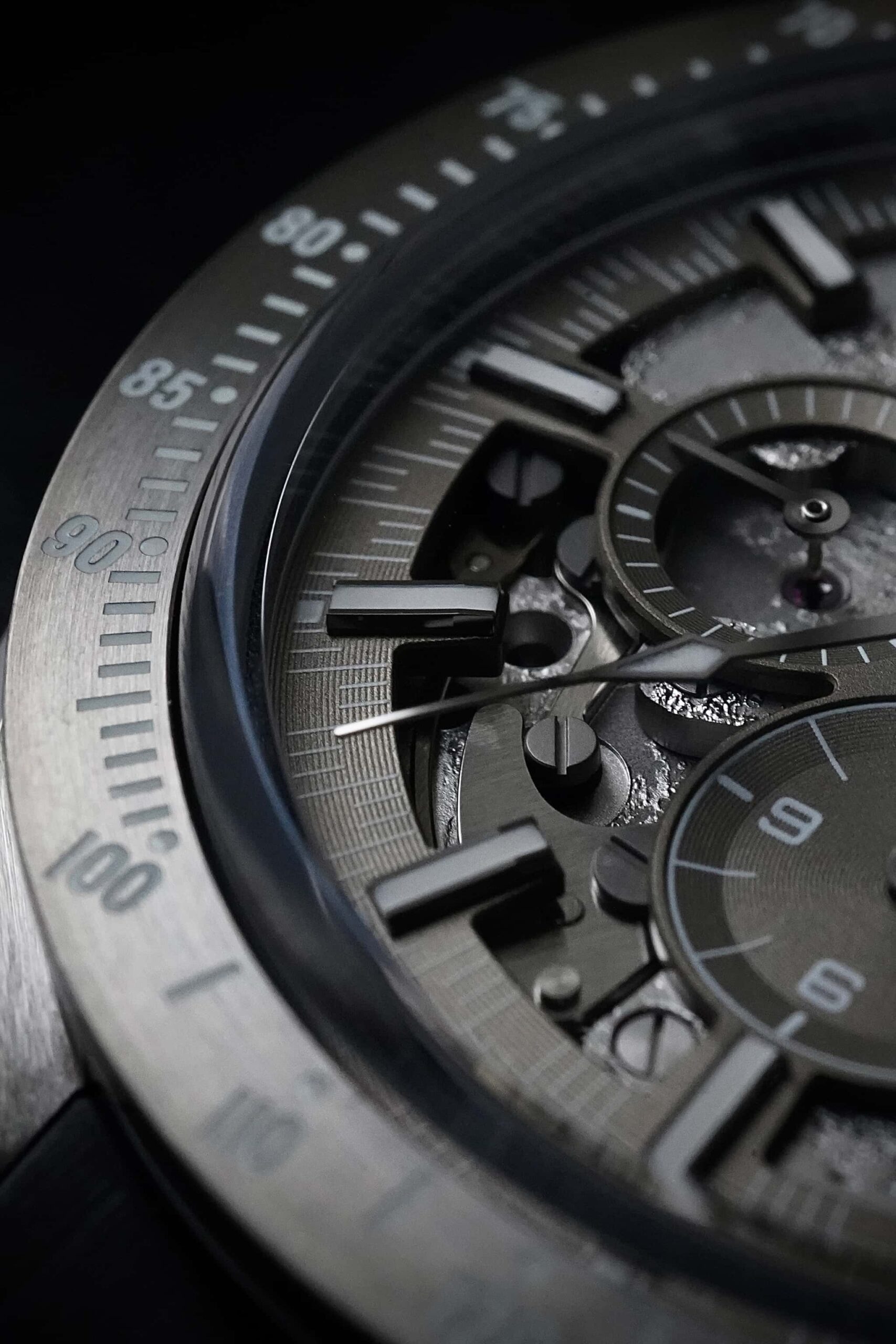 ストラップ部分も抜かりありません。本作専用に用意されたグレーカラーのラバーストラップの裏側には、なんとクレーター模様が。ラバー素材の成型技術も高いとは恐ろしい。加えて片開き式のバックル部分もケース同様のグレーセラミック(+チタン)製となっています。