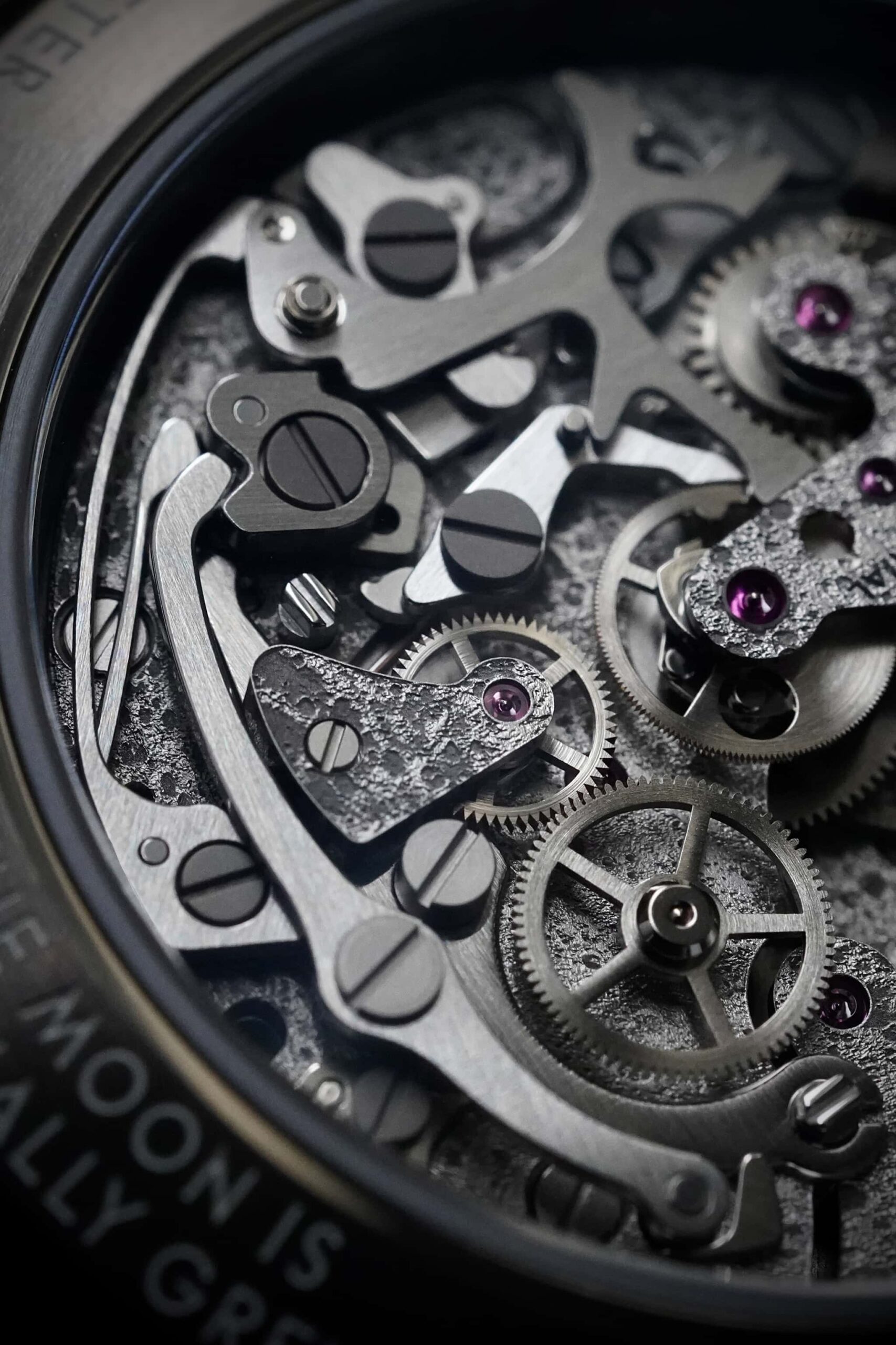 それでは撮りおろしのマクロ写真とともに詳しく見ていきましょう。ベースモデルの”ダークサイド オブ ザ ムーン アポロ8号”同様、オープンワークされた文字盤、というよりムーブメントの一部ですが、月のクレーターをリアルに再現した意匠は本作にも継承。実際の月の地表のようにグレーカラーにコーティングされているため、より一層リアリティを感じさせるものに仕上がっています。