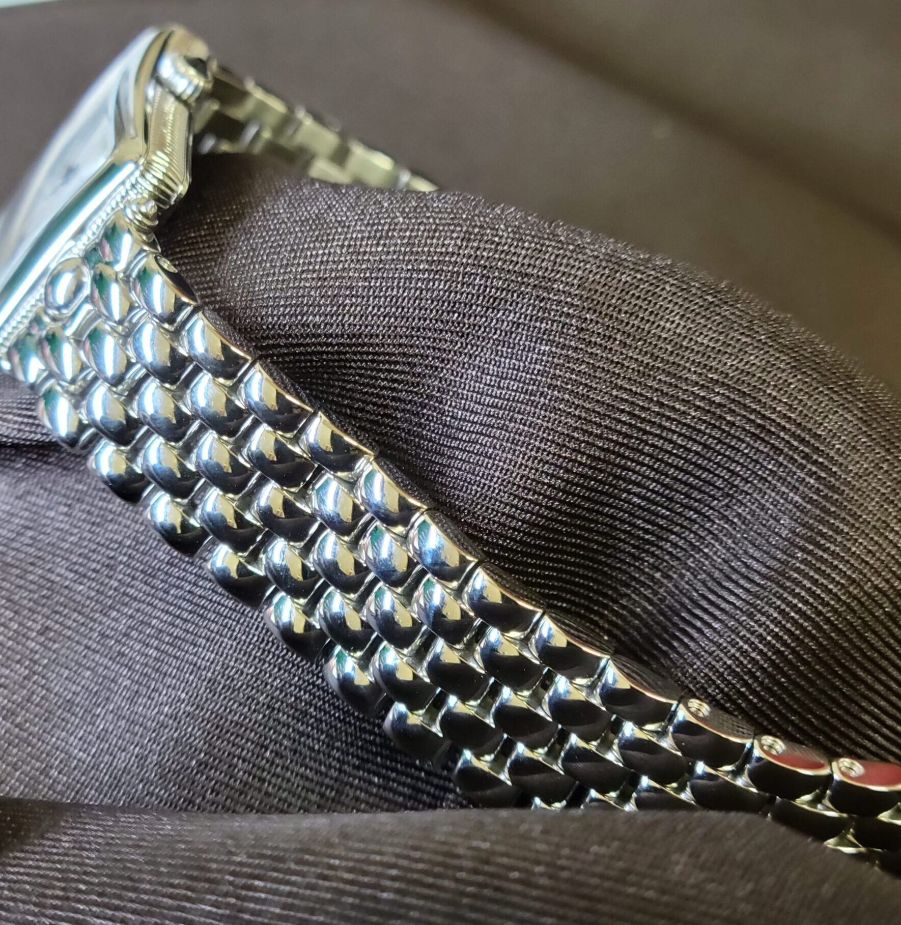 クラシック アールデコ カレは、気品あふれるジュエリーウォッチとしてデザインされており、ブレスレットも1コマ1コマがとても細かく設計されています。(5連ステンレスブレスを採用)