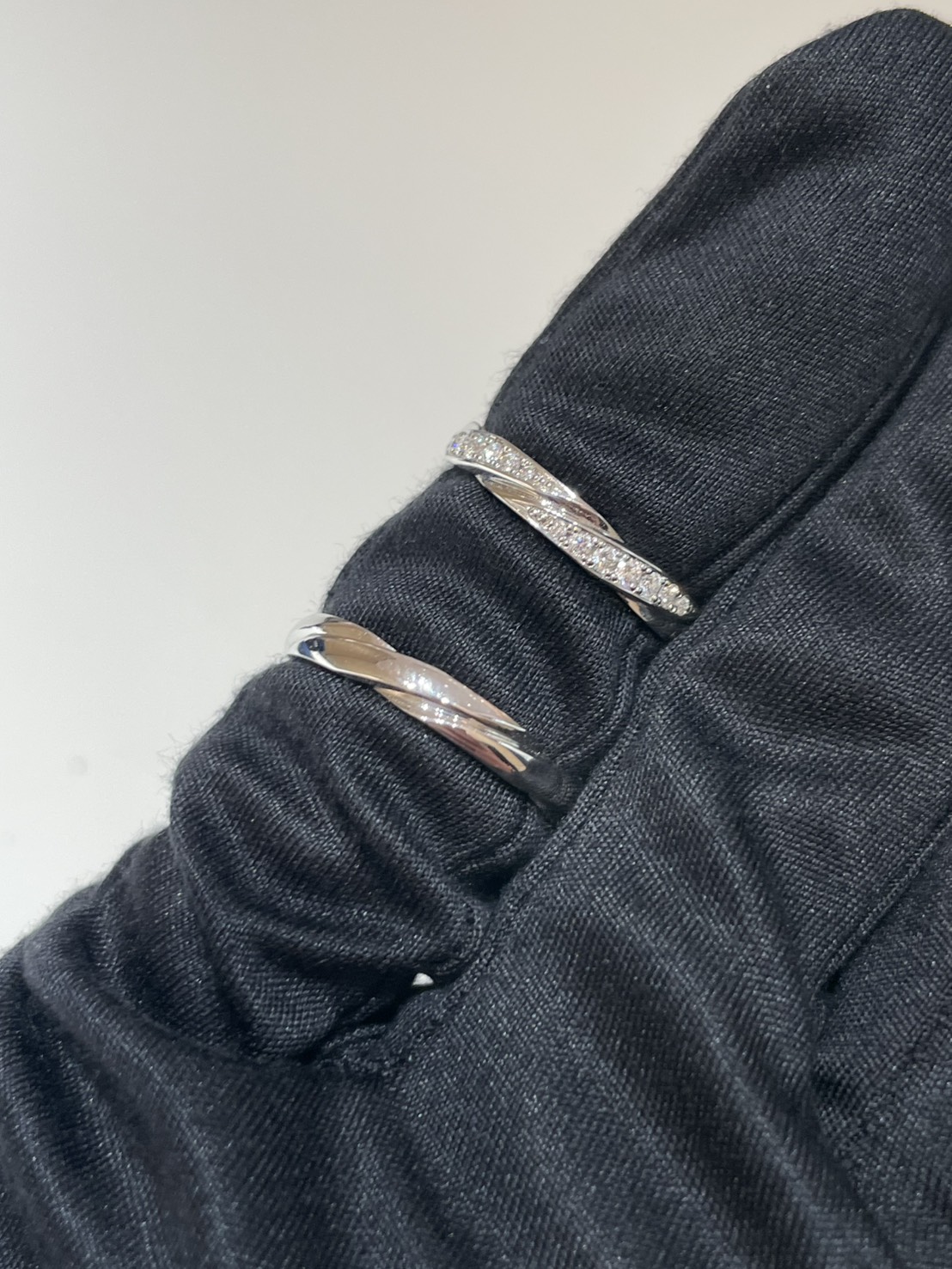 すこしねじりが入ったデザイン性のあるリングで、男性用はシンプル、女性用は流れるようにダイヤが入った定番で使用しやすいのが特徴です。