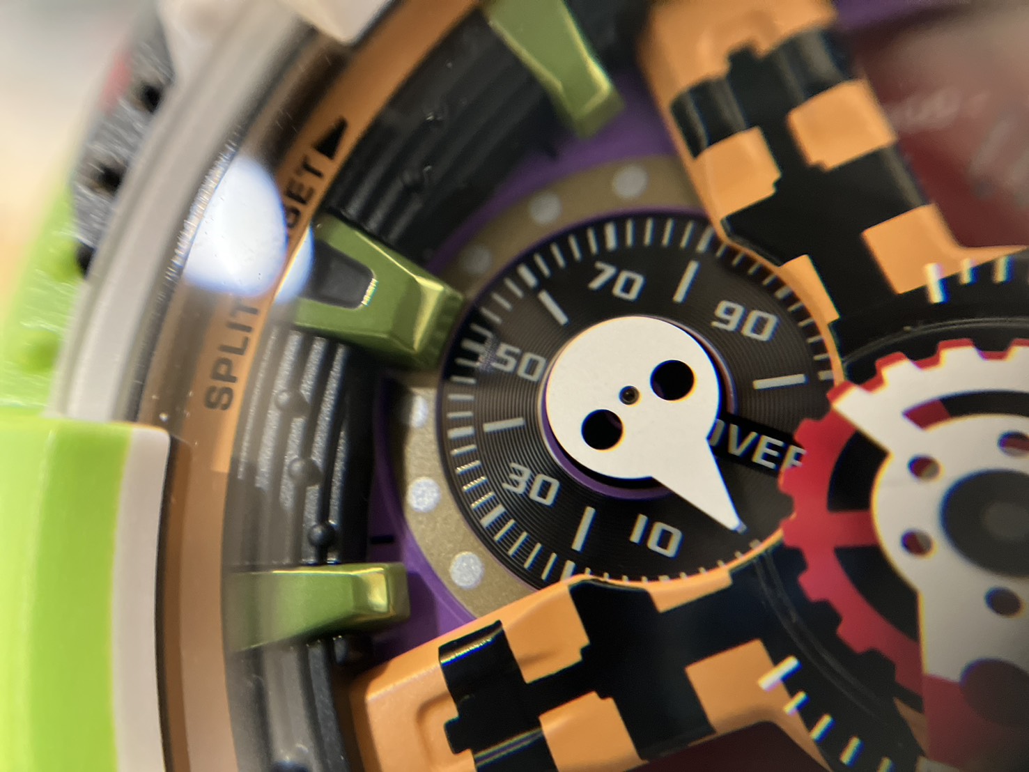 ダイヤル中央に施されたY字型のパーツ(オレンジ×ブラック)は、作品中で印象的な CAUTIONパターンをデザインしているとのことです!
