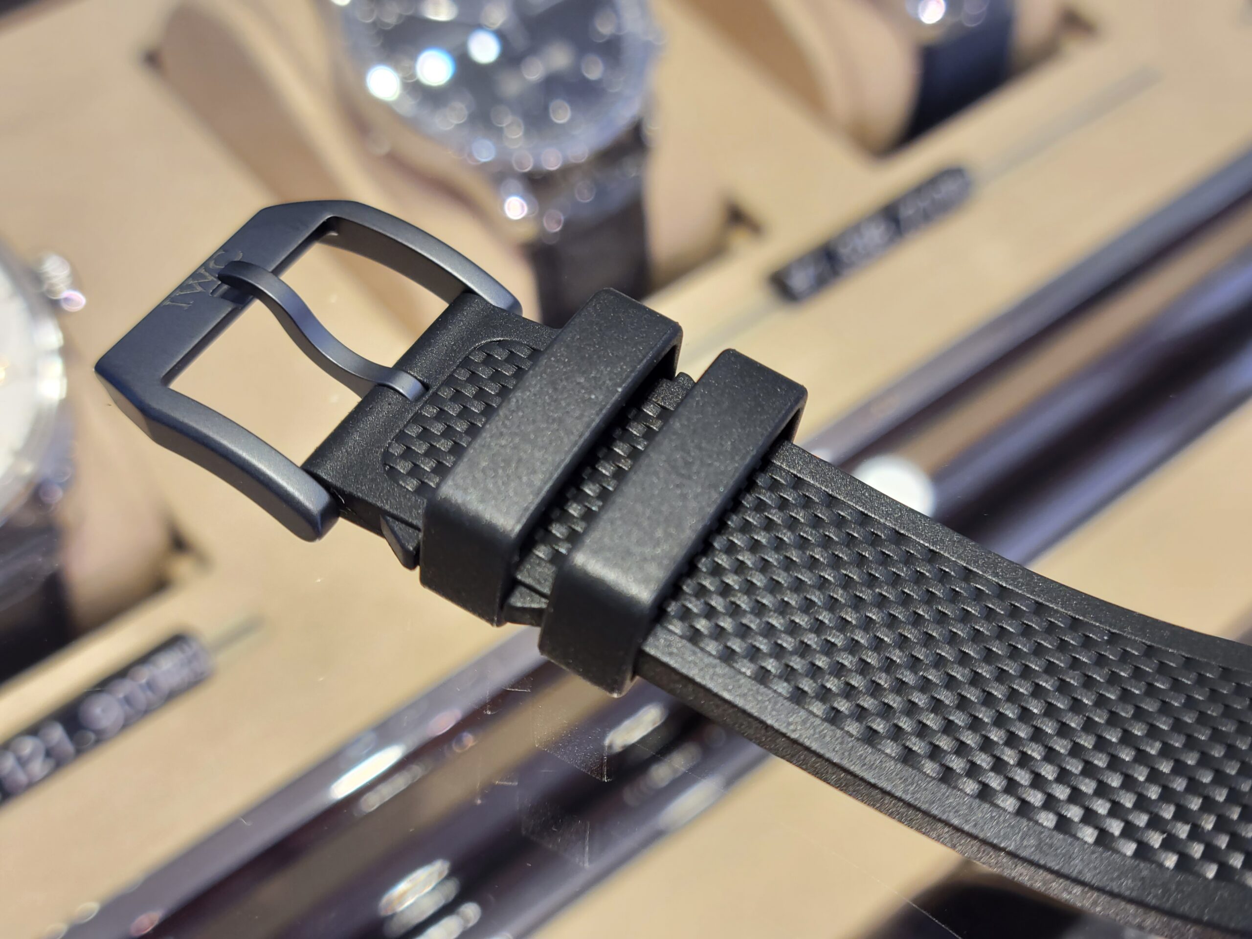 独特のスクエアパターンが施されたブラックのラバーストラップには、ブラック仕様のピンバックルが取り付けられています。