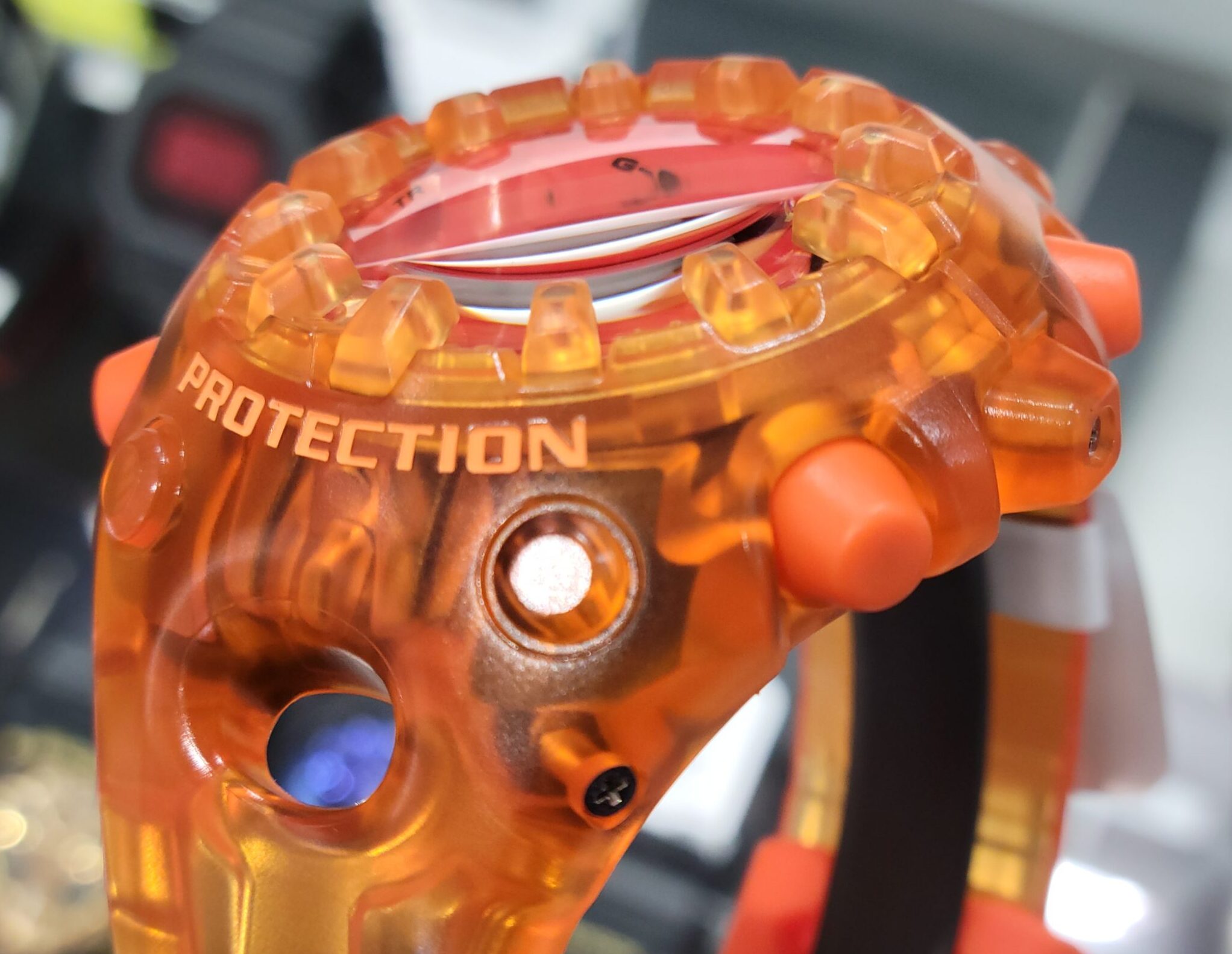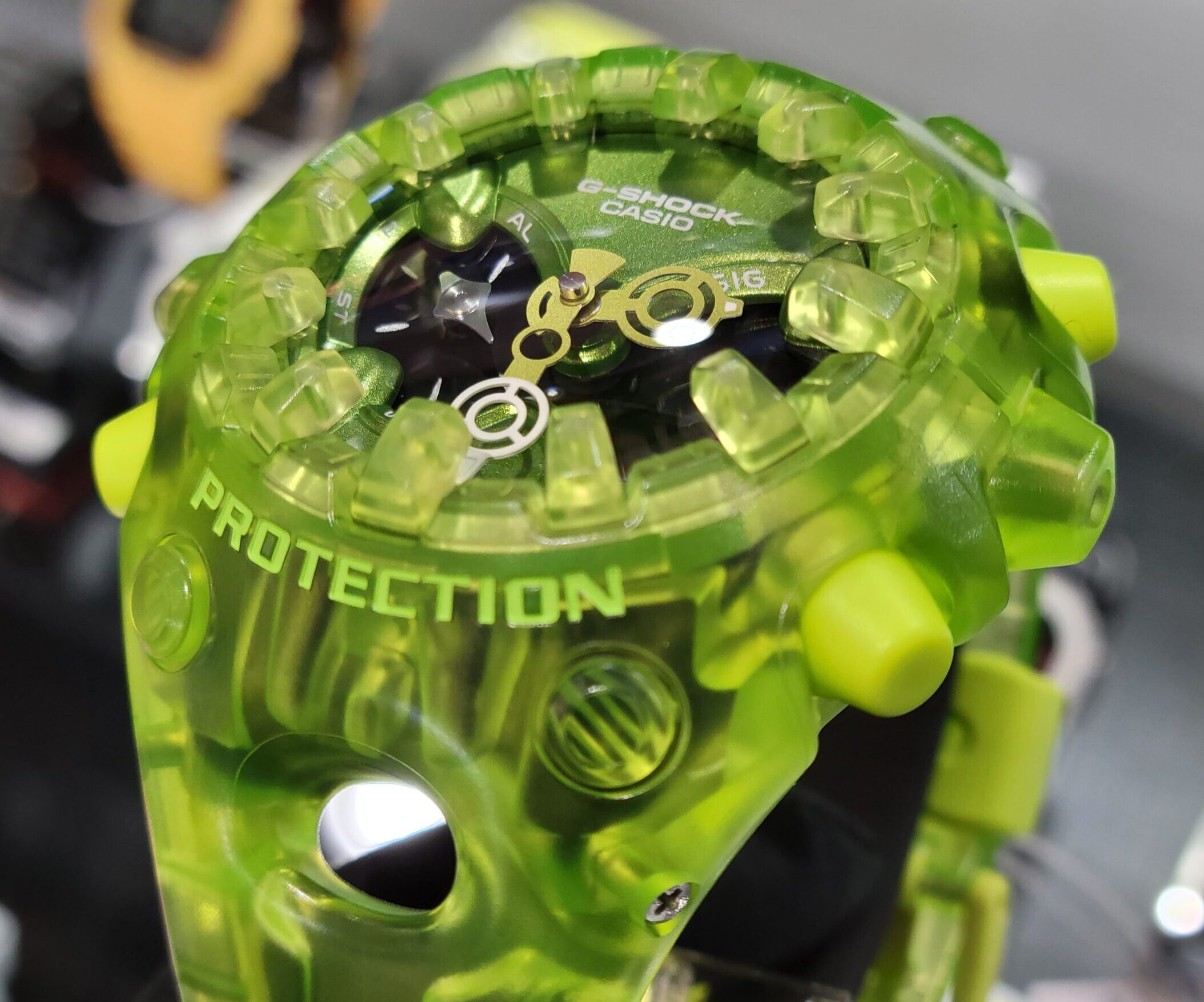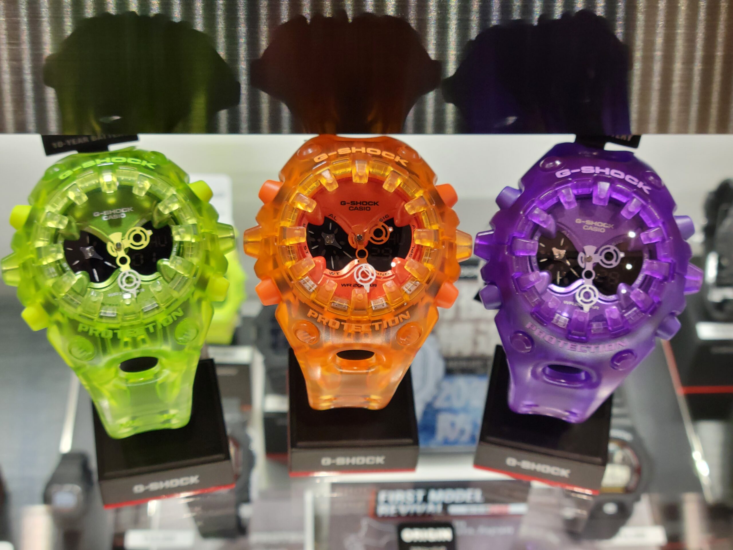 今回登場したモデルには、各カラーのメタリックダイアルを採用。カラフルなスケルトン仕様が一際目を引き付けてくれるシリーズとなっています!カラフルなスケルトンボディ&とげとげした形に、つい目が引かれますね。