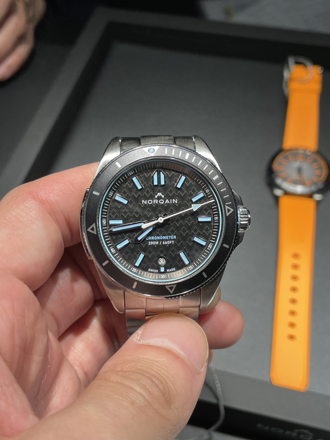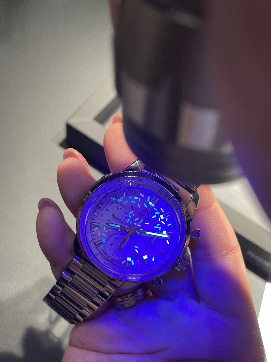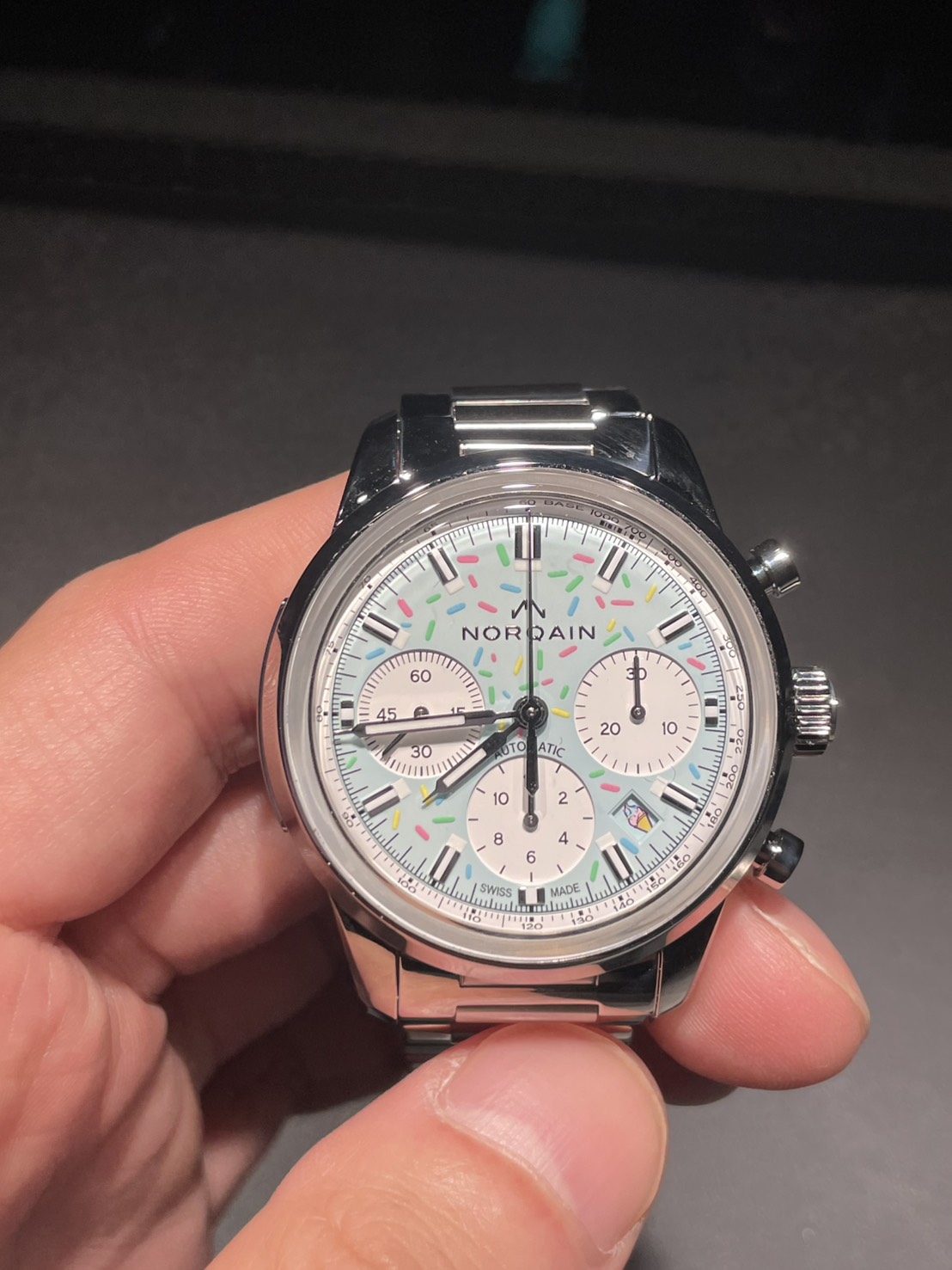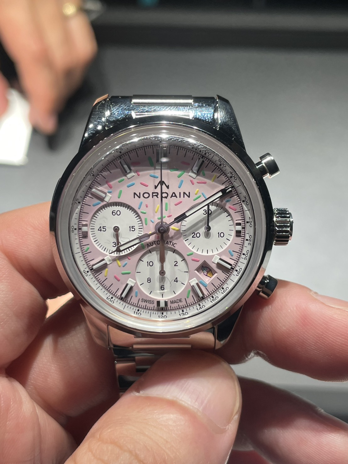 答えると「ノルケイン!!いい時計だね!これは~~~~~」と熱く語りだしましたが、私は言葉を理解するのに時間がかかったため忘れてしまいましたが、かなりほめてくれていました