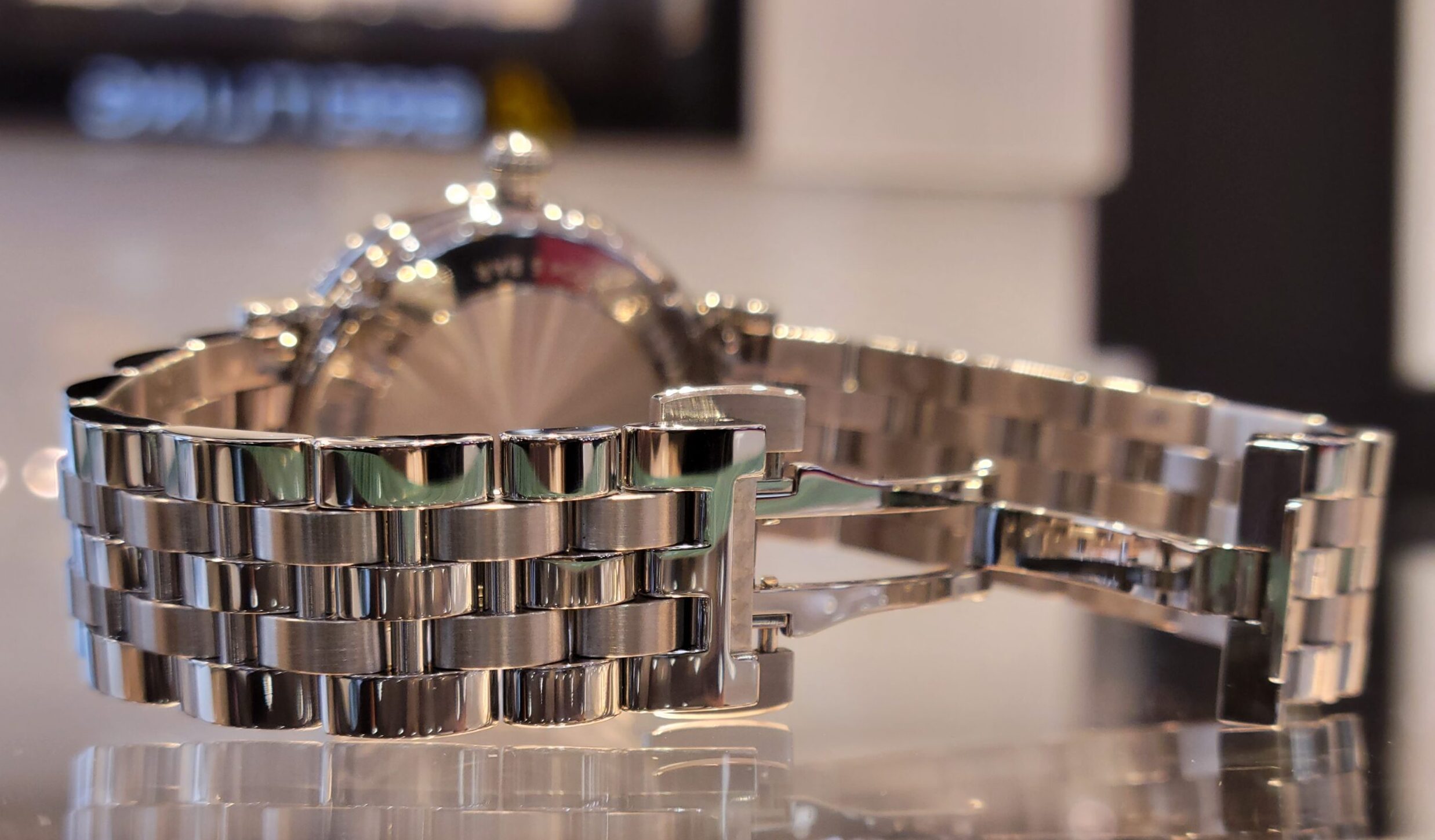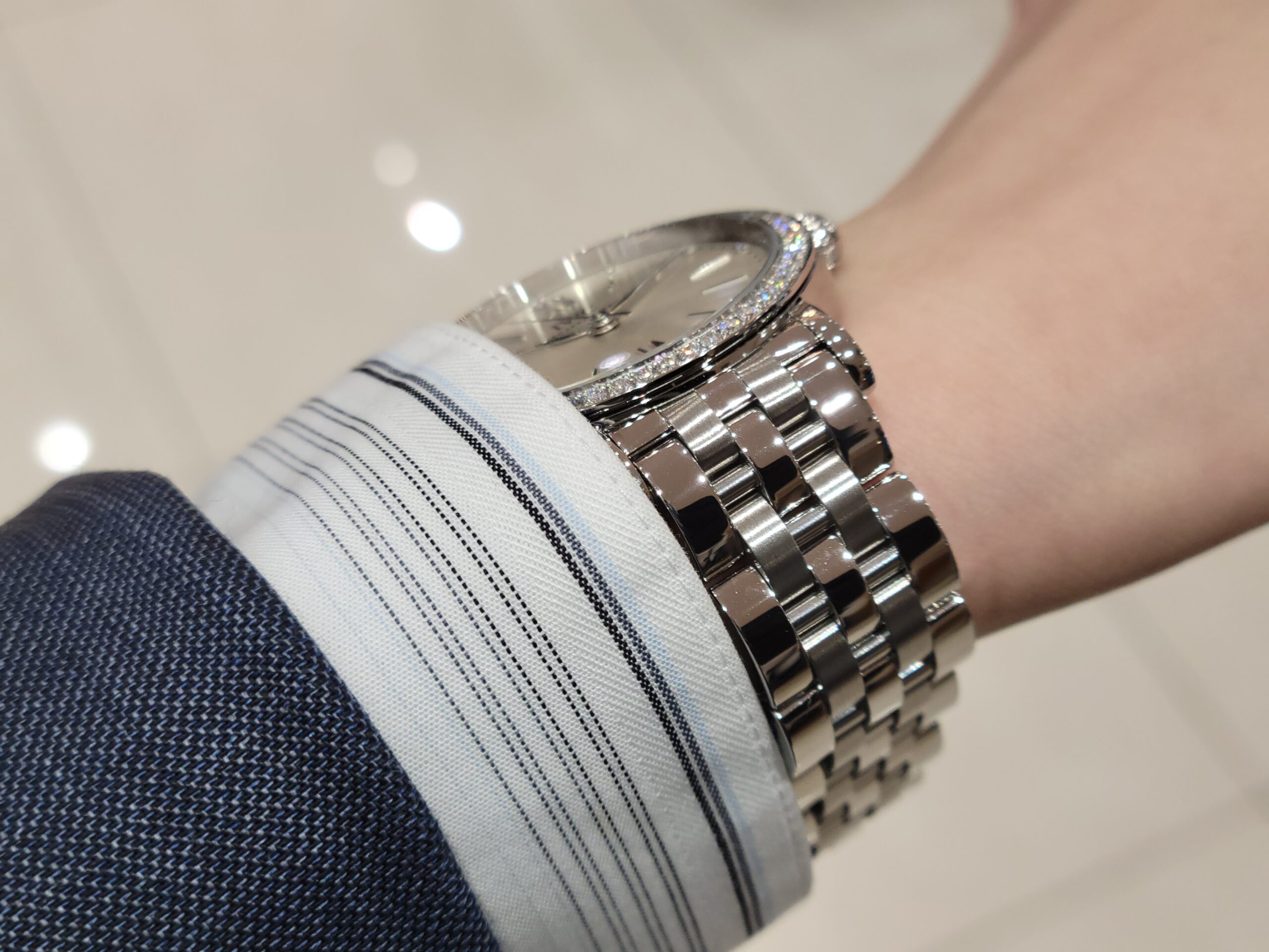 アップで撮影した時、実際に着用した時、着用後少し斜めから見た時等…どの角度から見ても、美しくダイヤモンドが輝き…素敵な時計だなと改めて感じました。ダイヤモンドジュエリーと合わせると、より統一感が生まれ、より女性らしさを印象づけてくれると思います。