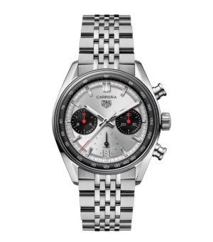 ドーム型サファイアクリスタルで保護されたダイヤルには、一目でわかる「Carrera」の名と「HEUER」のシールドロゴがプリントされ、レトロな見た目を演出します。